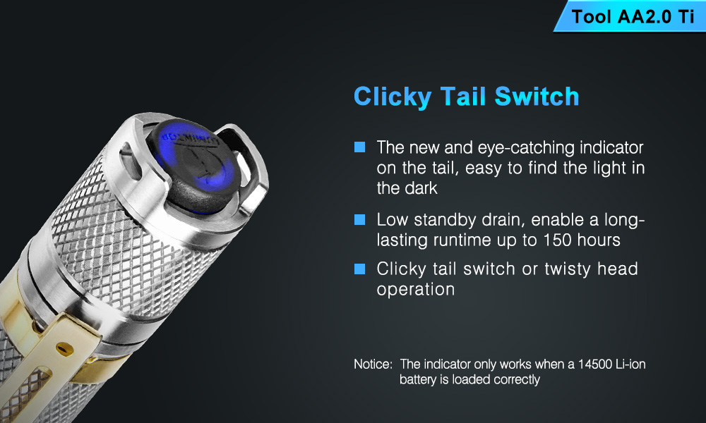 - An indicator light on the tail, easy to be found the light in the dark (only works for 14500 Li-ion battery)