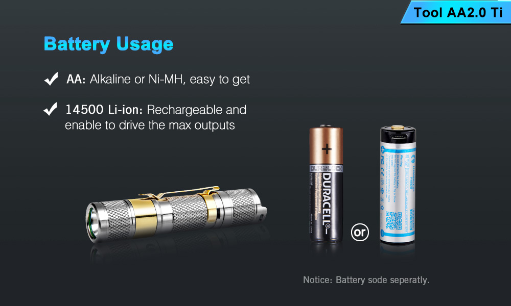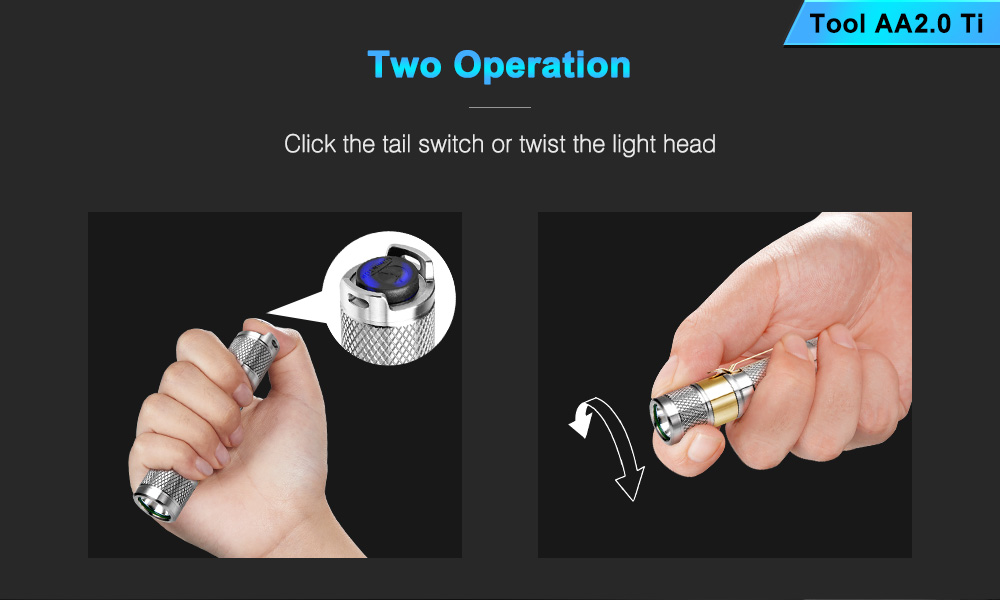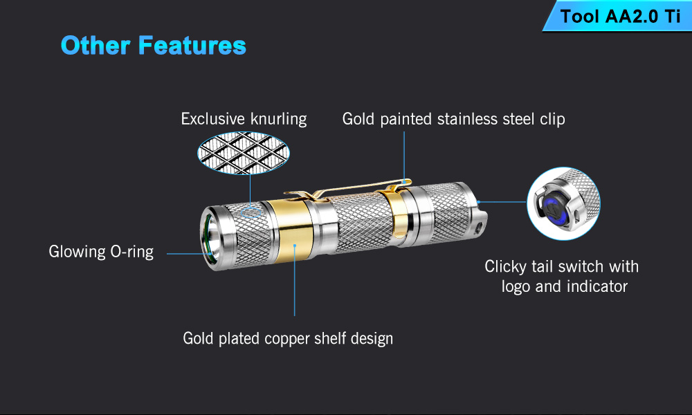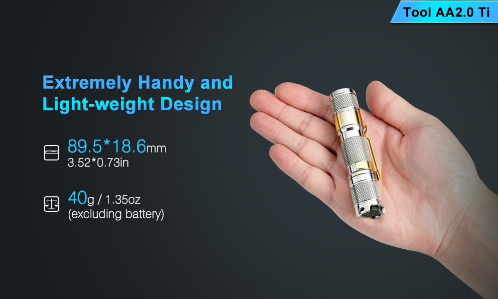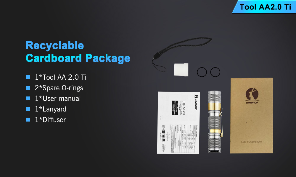 - Package contents: 1*Tool AA2.0 Ti flashlight, 1*Manual, 1*Diffuser, 1*Lanyard
