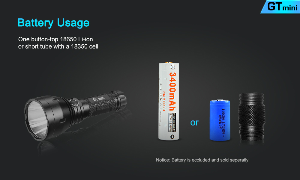 Battery: One button-top 18650 (or 18350 with the short tube).