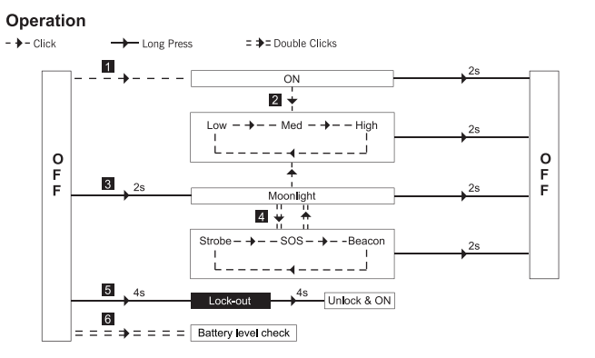 Operation General modes: Low/ Med/ High Hidden Modes: Moonlight/ Strobe/ SOS/ Beacon