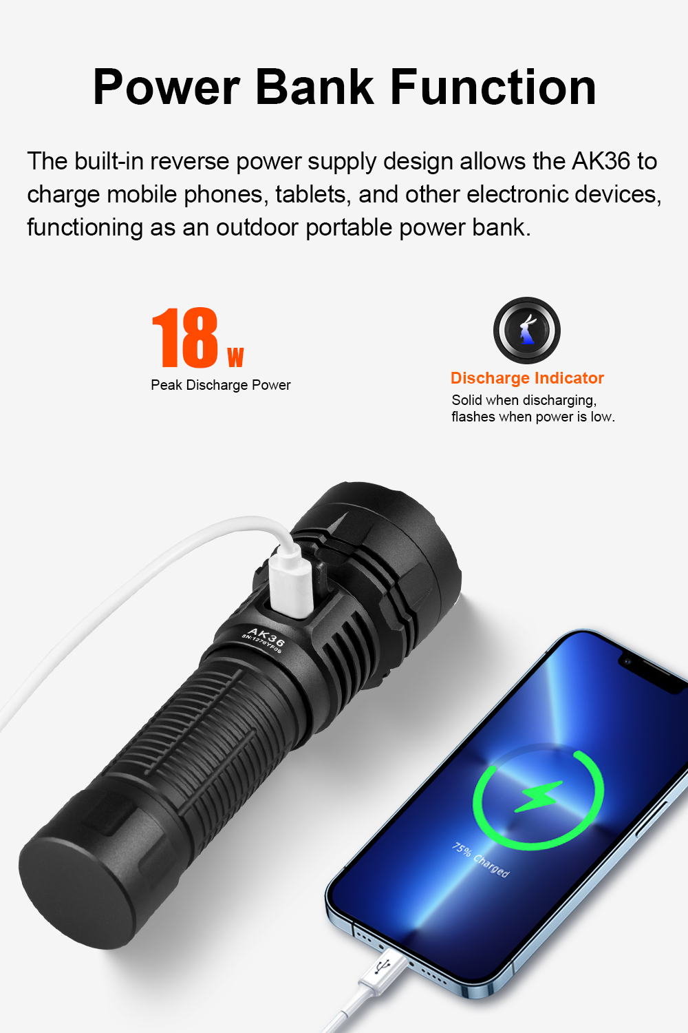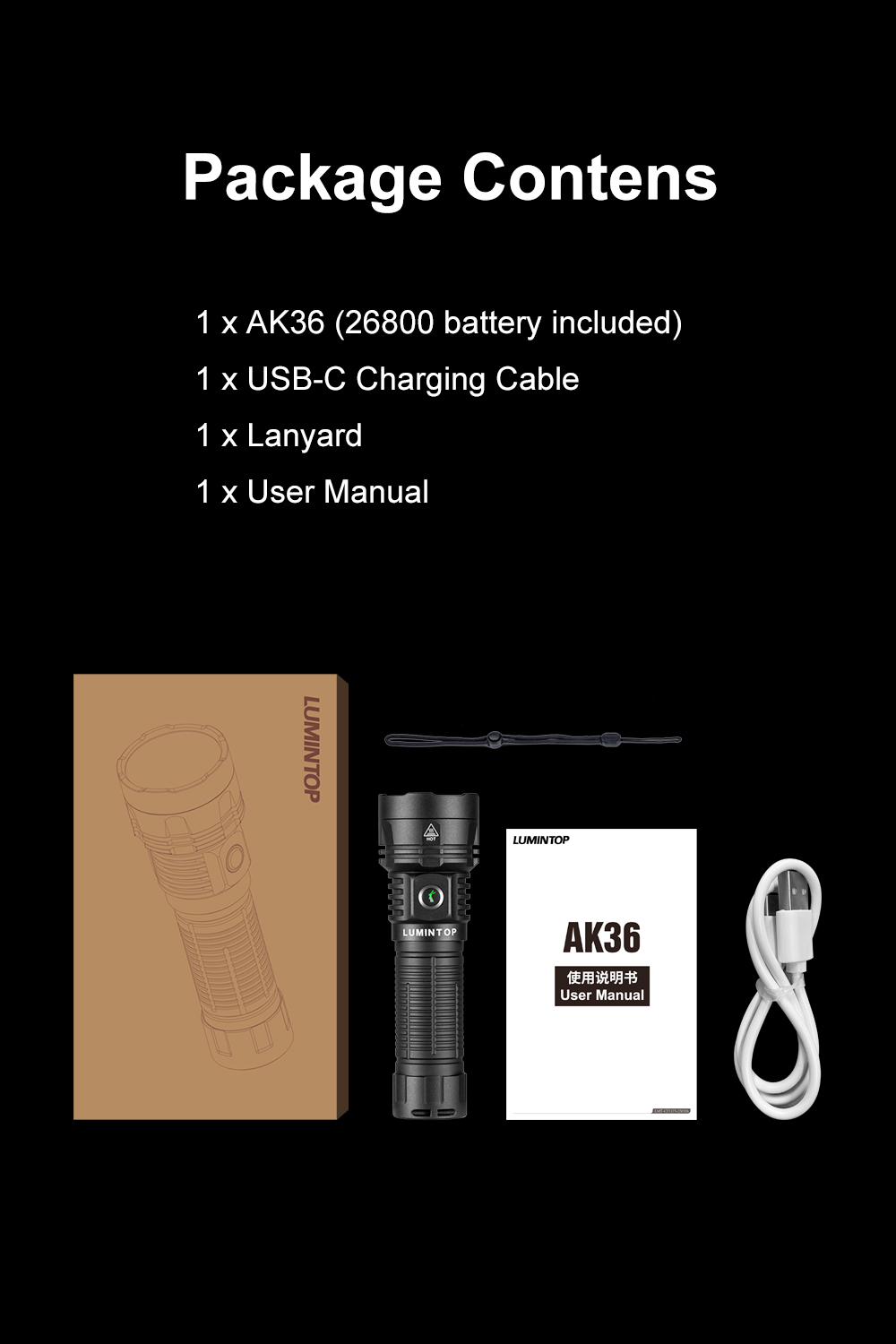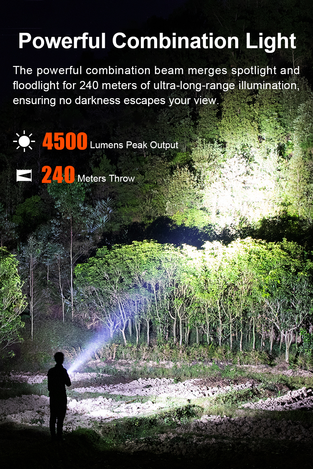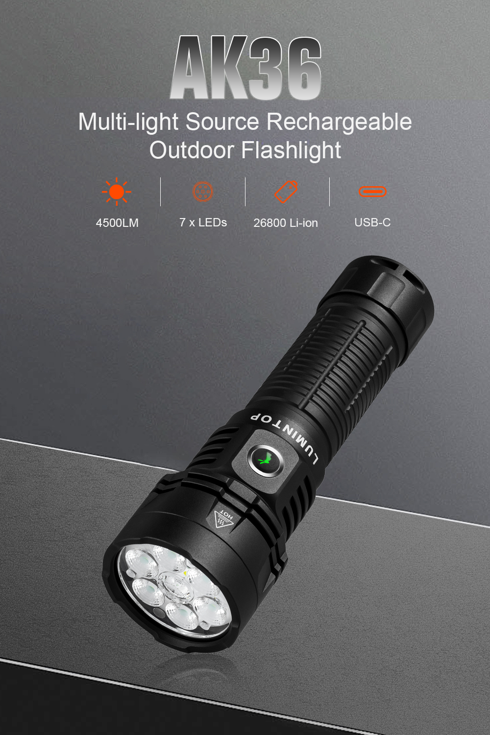 AK36 is a powerful dual-beam rechargeable flashlight delivering up to 4500LM with both spotlight and floodlight. Featuring long runtime, USB-C charging, magnetic tail, and IPX-8 waterproof rating, it's built for outdoor, work, and emergency use.