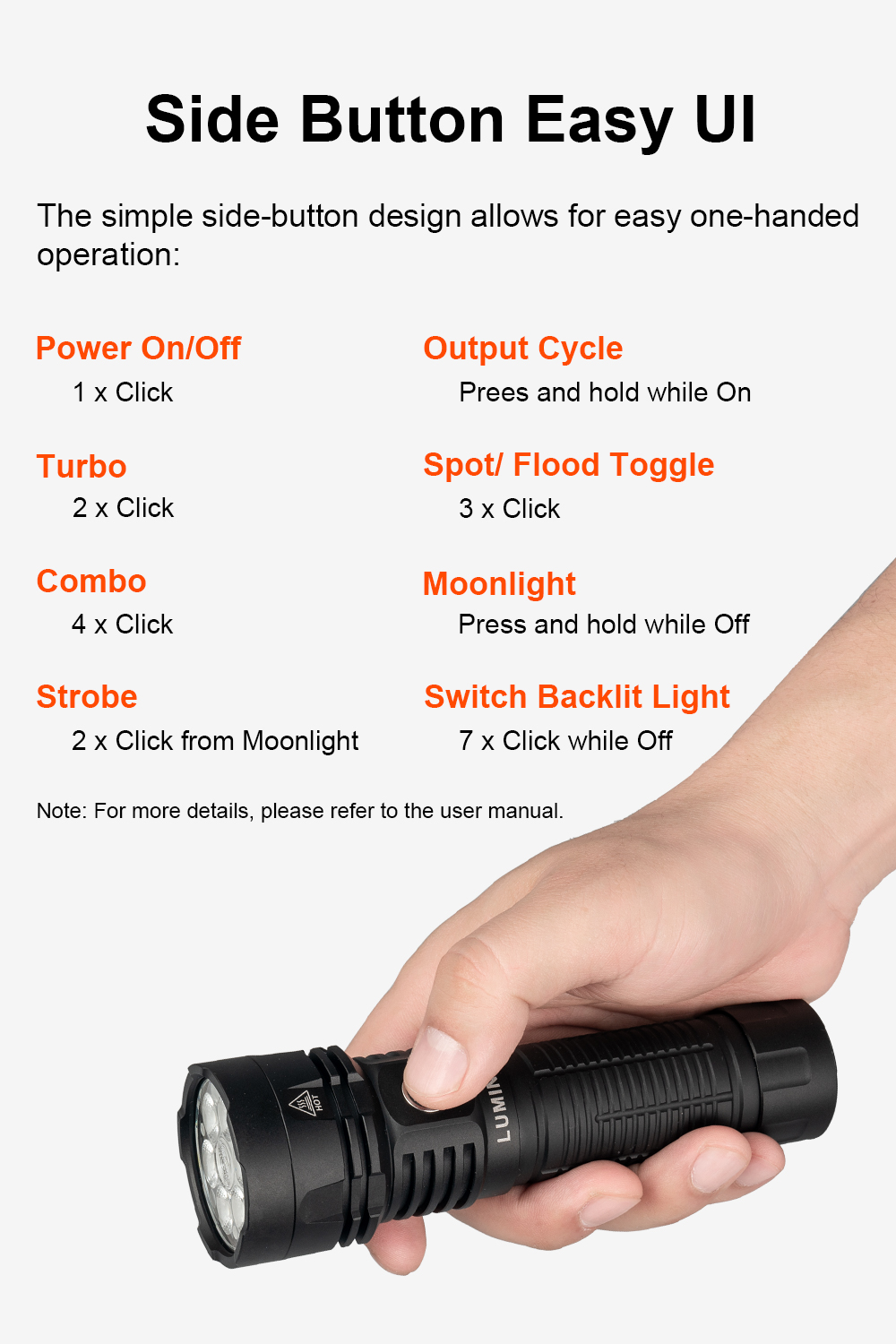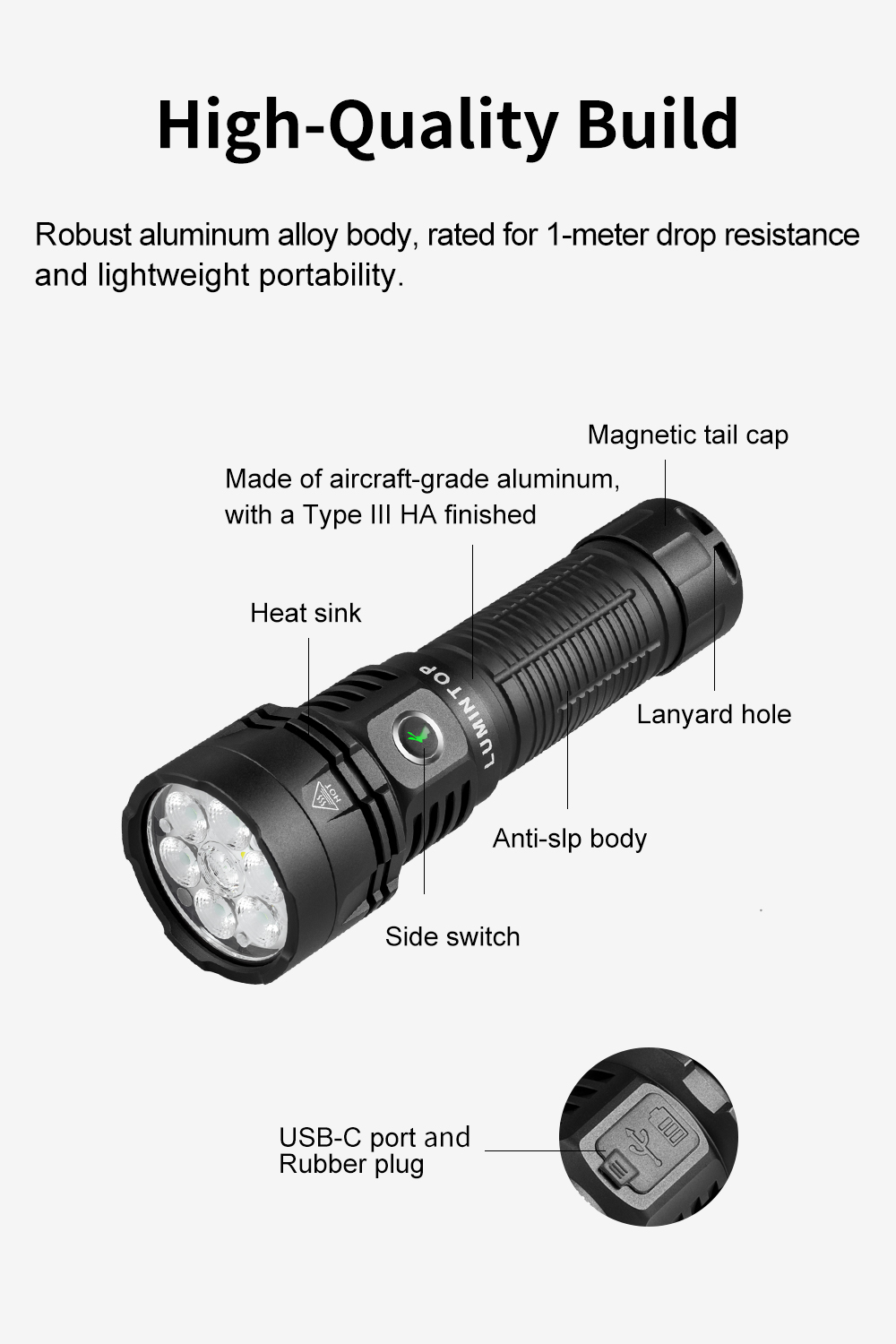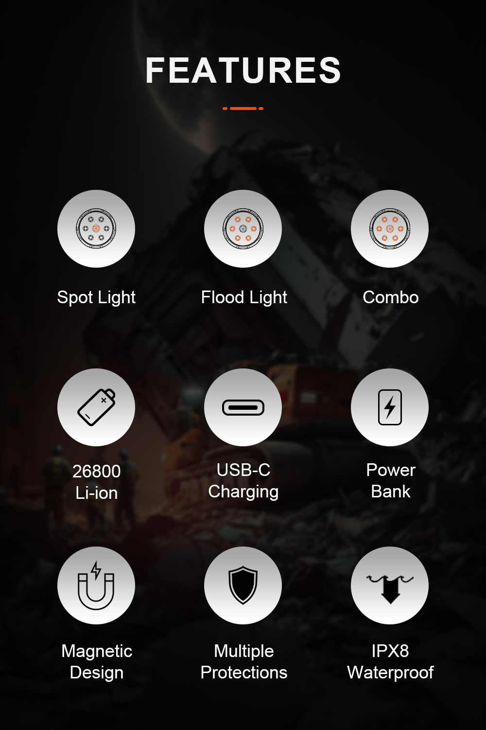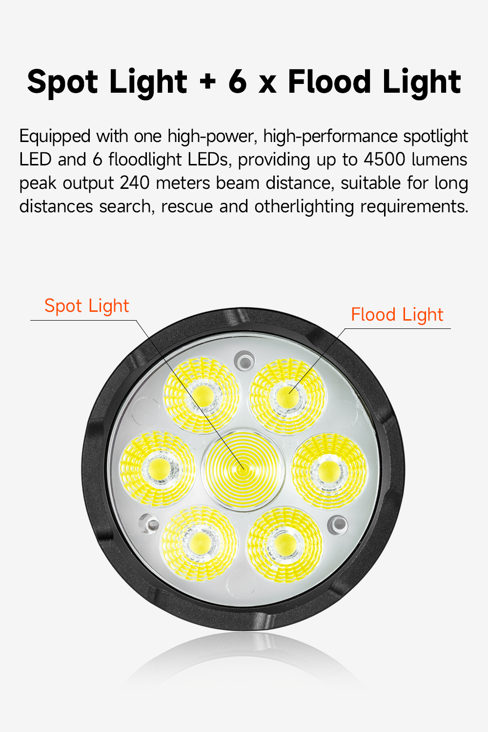 AK36 is a powerful dual-beam rechargeable flashlight delivering up to 4500LM with both spotlight and floodlight. Featuring long runtime, USB-C charging, magnetic tail, and IPX-8 waterproof rating, it's built for outdoor, work, and emergency use.
