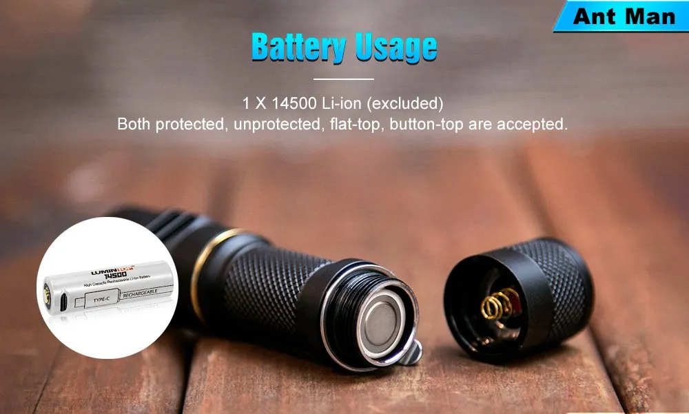 The battery in the options is the Lumintop 3.7V/920mAh 14500 Li-ion with a built-in Type C charging port.
