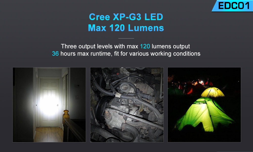 3 modes with a max 120 lumens output and an up to 36 hours runtime