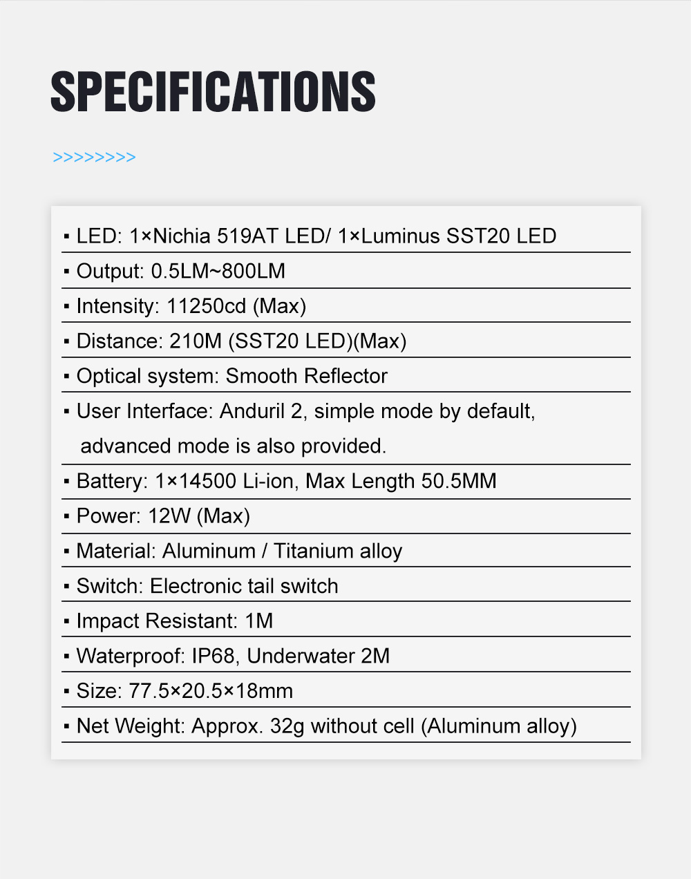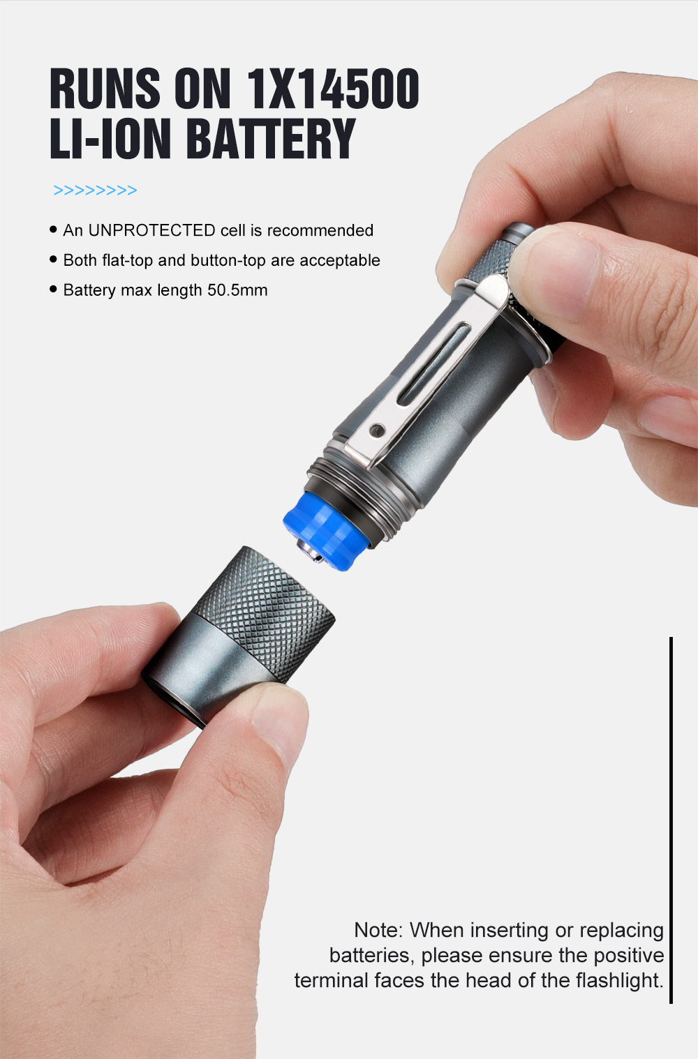 Battery: One high-drain and 14500 Li-ion cell. Max length 50.5mm. Cell is not included.