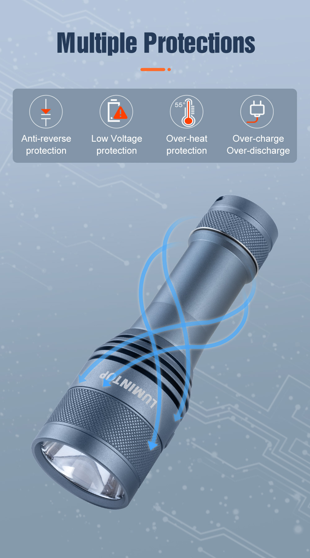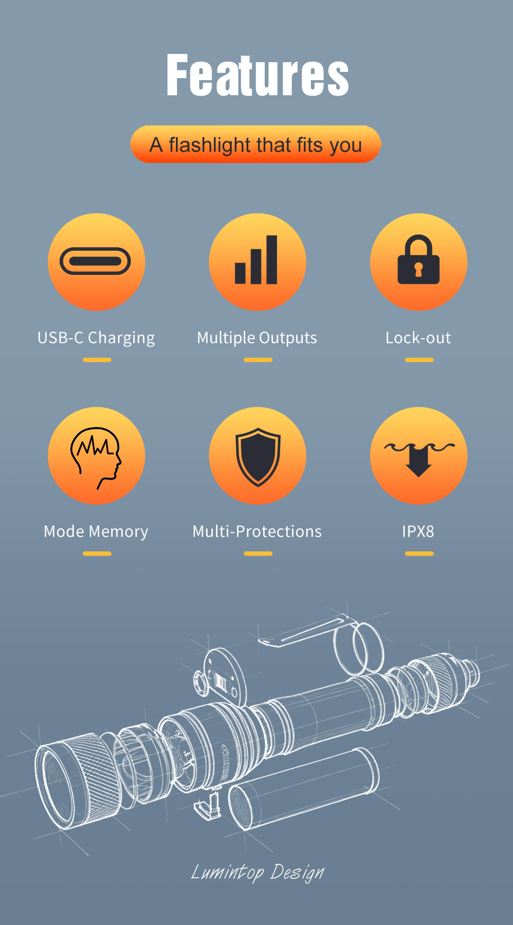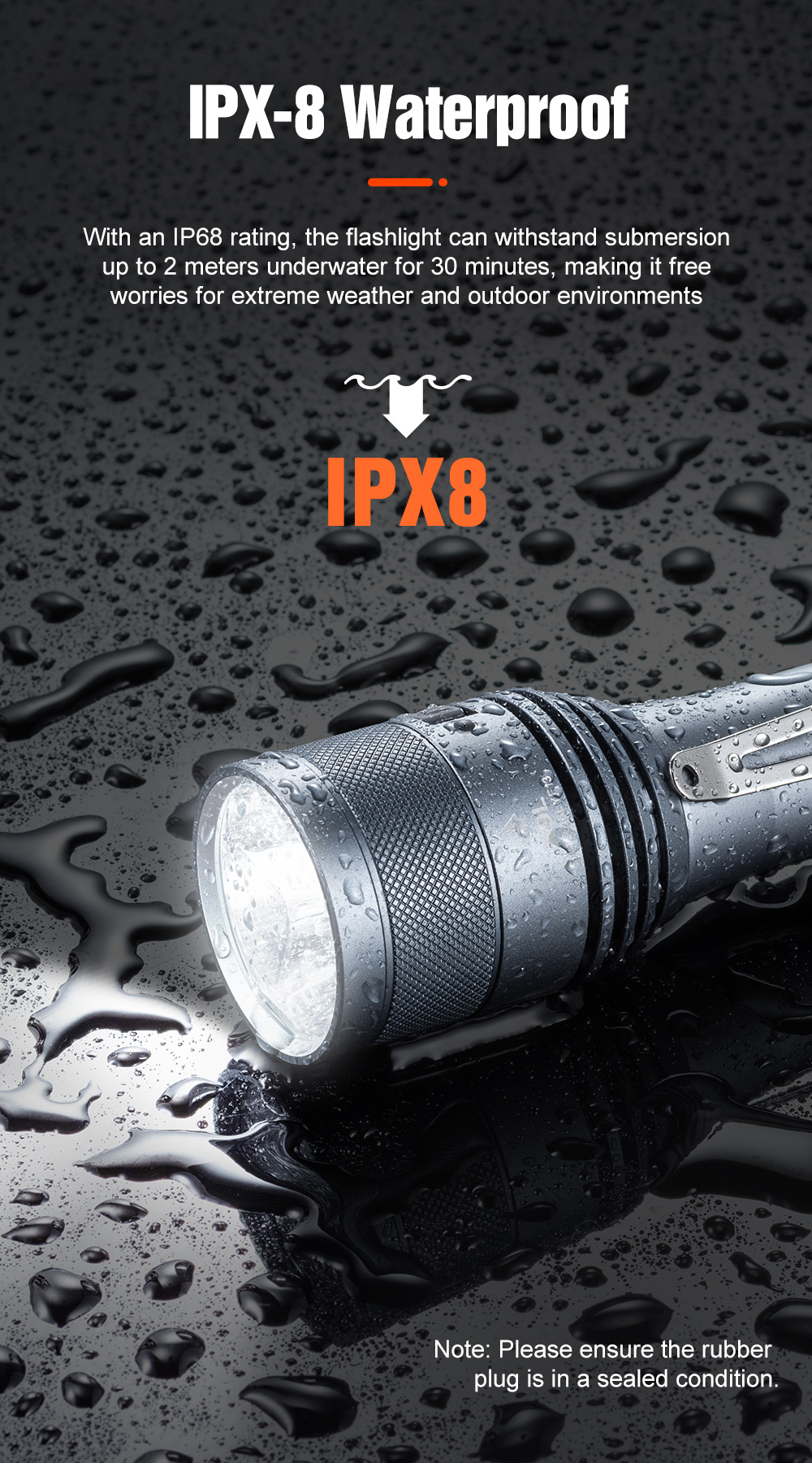 IPX-8 waterproof ability, stainless steel clip and lanyard hold inlcuded