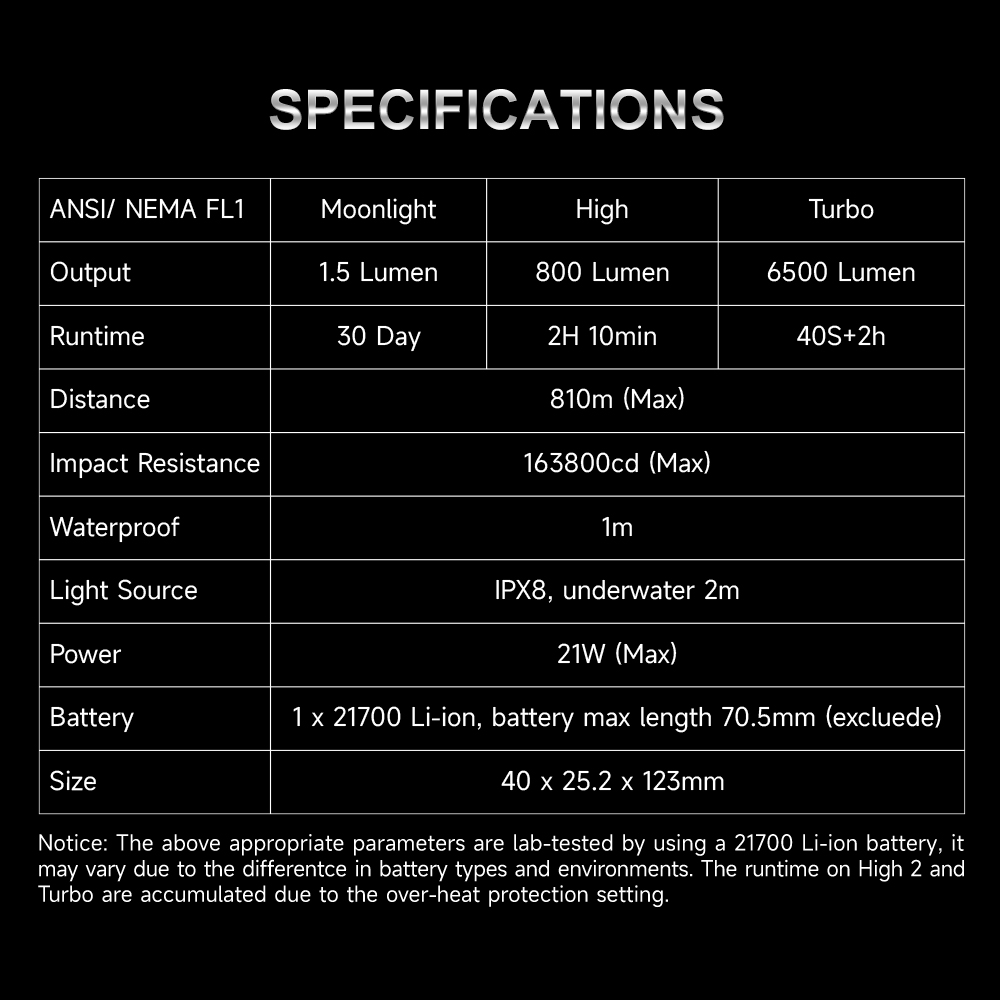 | Battery | 1 X 21700 Li-ion, battery max length 70.5mm (excluded) | ||