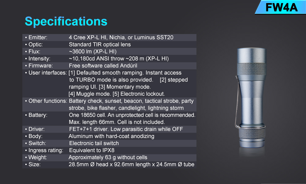Battery: One 18650 cell. An unprotected cell is recommended. Max. length 66mm. The cell is not included.