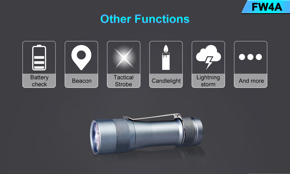 Other functions: Battery check, sunset, beacon, tactical strobe, party strobe, bike flasher, candlelight, lightning storm