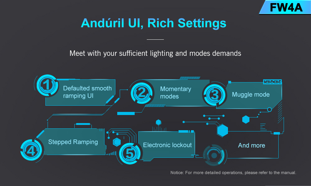 User interfaces: [1] Defaulted SMOOTH RAMPING. Instant access to TURBO mode is also provided. [2] STEPPED RAMPING UI. [3] MOMENTARY mode. [4] MUGGLE mode. [5] Electronic LOCKOUT.
