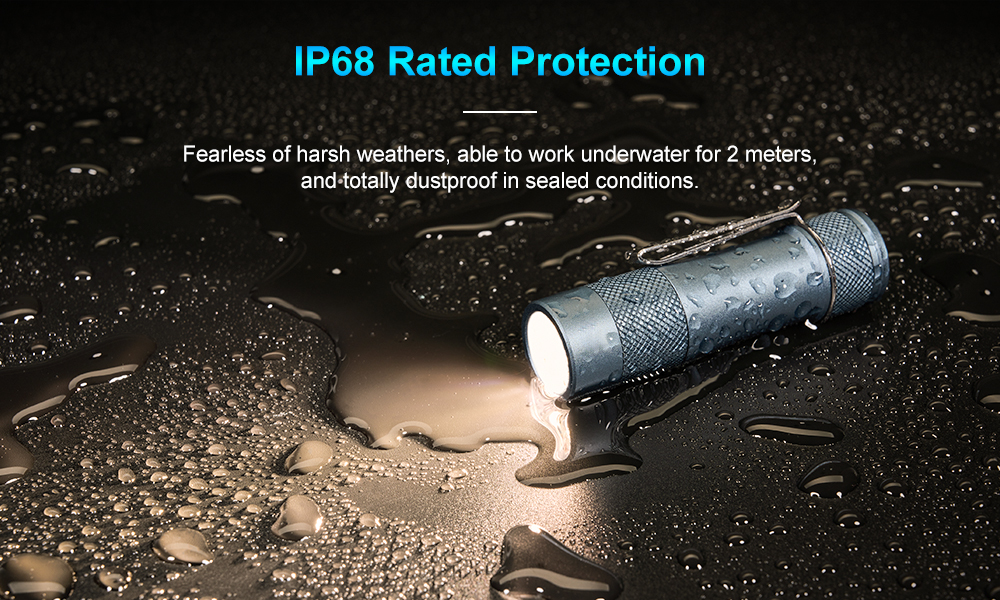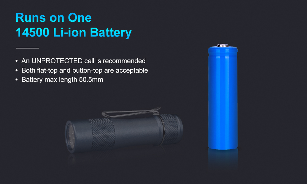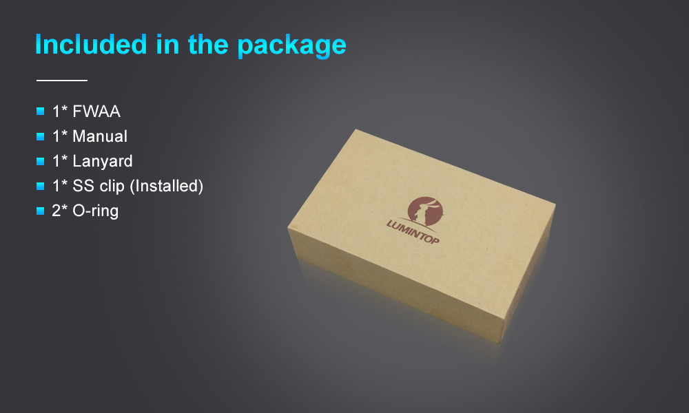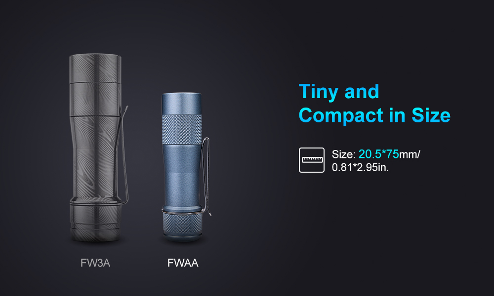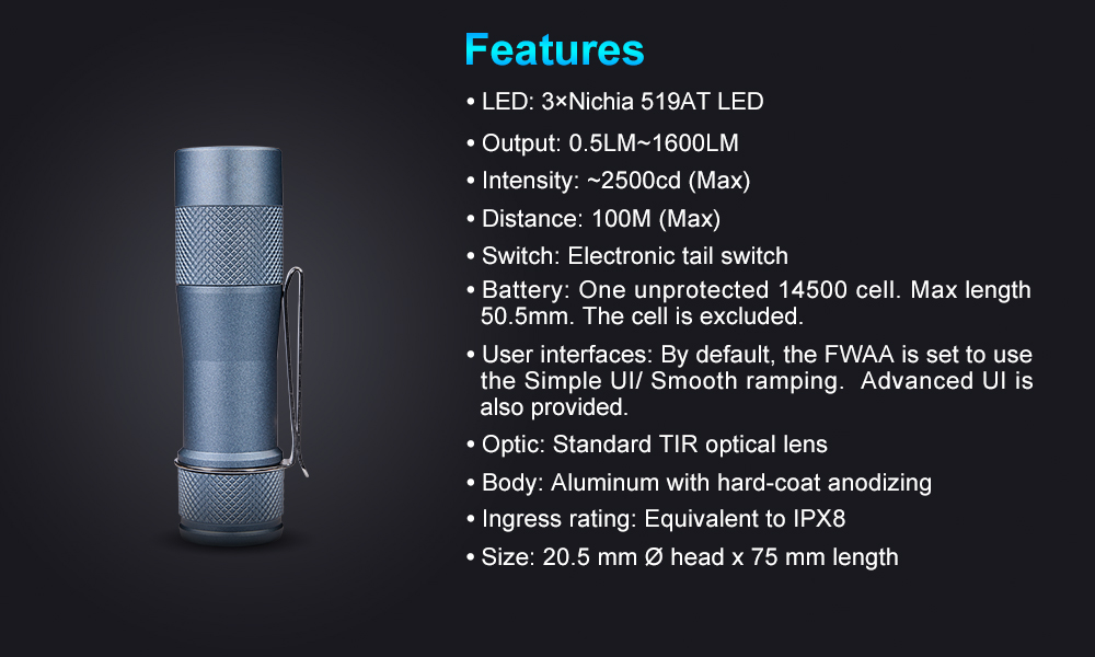 Features LED: 3 x Nichia 519AT LED, 4000K Output: 0.5LM~1600LM Intensity: 2500cd (Max) Distance: ANSI~100M (Max) Switch: Eletronic tail switch Battery: One high drain and unprotected 14500 cell. Max length 50.5mm. Cell is not included. User interfaces: Anduril 2 UI, by default the FWAA is set to use simple mode with SMOOTH RAMPING. Advanced mode is also provided. Optic: Standard TIR Optical Lens Body: Aluminum or Titanium Alloy Ingress rating: Equivalent to IPX8
