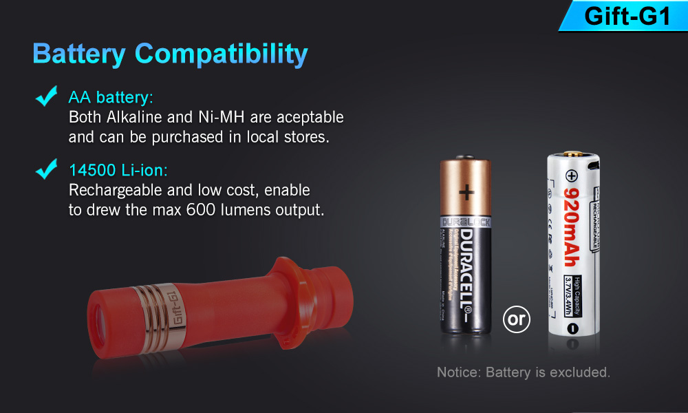 Notice: The battery in the option is the Lumintop 920mAh 14500 Li-ion with a Micro USB charging port.