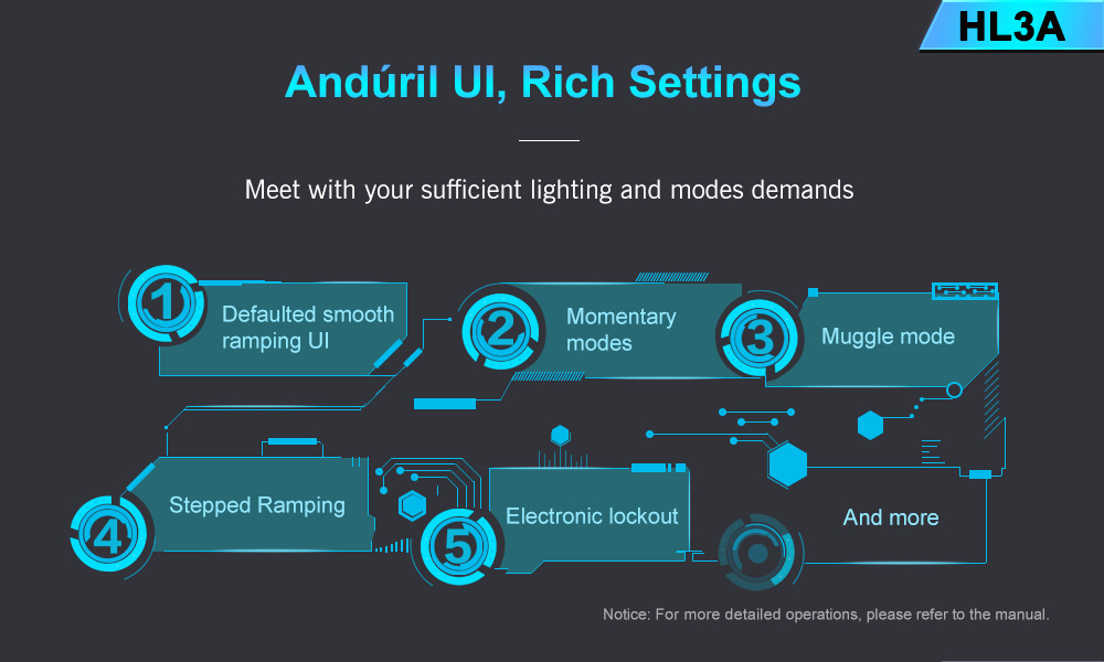 User interfaces: [1] Defaulted SMOOTH RAMPING. Instant access to TURBO mode is also provided. [2] STEPPED RAMPING UI. [3] MOMENTARY mode. [4] MUGGLE mode. [5] Electronic LOCKOUT.