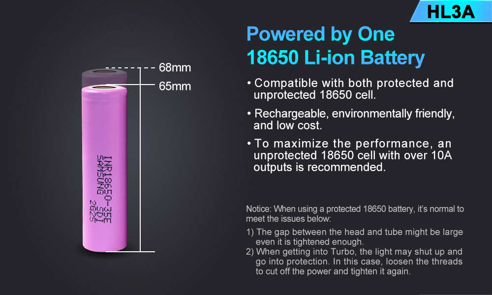 Battery: One 18650 cell. An unprotected cell is recommended. Max. length 66mm. The cell is not included.