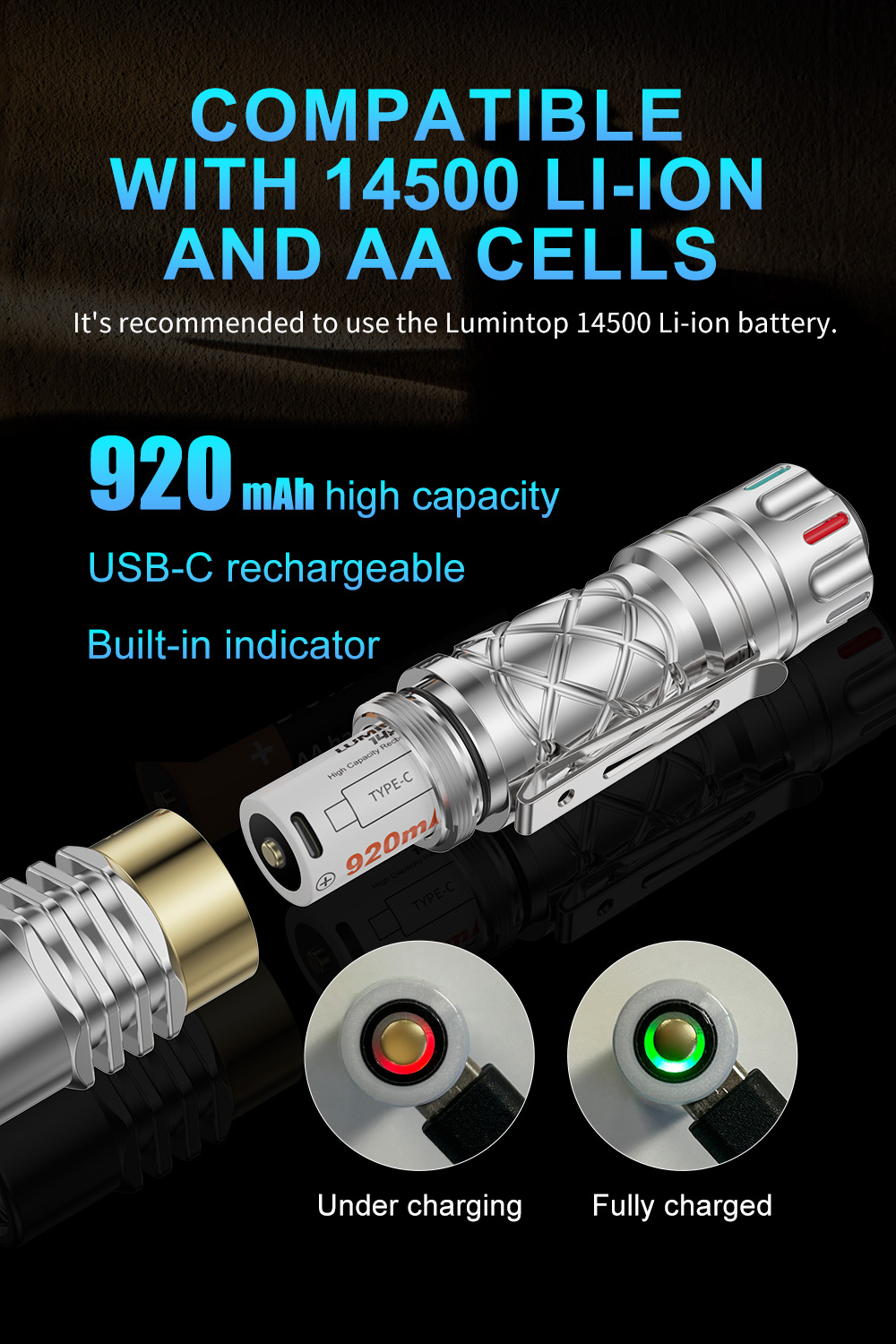 | BATTERY | 1 X 14500 Li-ion/ AA (excluded) | ||||